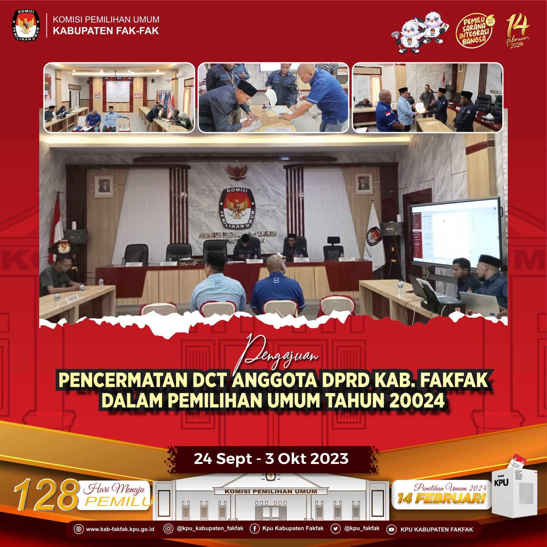 kab-fakfak.kpu.go.id - Selasa, 26 September 2023 bertempat di Aula Kantor Komisi Pemilihan Umum Kabupaten ( KPU ) Fakfak, telah melaksanakan Pencermatan Rancangan Daftar Calon Tetap (DCT). Partai Hati Nurani Rakyat (HANURA) menjadi partai politik (parpol) pertama yang mengajukan calon anggota DPRD pada masa pencermatan rancangan DCT. Kemudian berlanjut pada (30/09) oleh PSI, diikuti (02/10) Partai Demokrat, PBB, PERINDO dan PKB. Dihari terakhir, pencermatan dilaksanakan untuk 12 partai sisanya sekaligus mengakhiri masa Pencermatan Rancangan DCT sejumlah 18 (delapan belas) parpol tingkat Kabupaten Fakfak peserta pemilihan umum ( Pemilu ) tahun 2024 pada selasa, 3 Oktober 2023 pagi sampai dengan penandatanganan sekaligus penyerahan tanda terima berkas pada pukul 23.47 WIT yang menandai berakhirnya kegiatan dengan foto bersama partai PDI-P sebagai partai terakhir yang melaksanakan Pencermatan Rancangan DCT. Dalam pelaksanaan kegiatan ini, beberapa partai ada yang melakukan perubahan (pergantian) calon, diantaranya partai Demokrat dengan tidak mengganggu kuota yang telah ada pada Daftar Calon Sementara (DCS) sebelumnya, selebihnya ada juga yang hanya melakukan perubahan berupa foto saja. “Kepada seluruh Bacalon yang menjabat sebagai Aparatur Sipil Negara (ASN), TNI, POLRI, Kepala Kampung, Aparat Kampung dan profesi lain yang penghasilannya bersumber dari uang negara harus segera memasukan SK Pemberhentian atau SK Pensiun sebelum tanggal 3 Desember 2023, jika tidak maka peserta Bacalon anggota DPRD namanya tidak terakomodir sebagai Calon Anggota Tetap DPRD Kabupaten Fakfak dalam Pemilu 2024 nanti” tandas Yosan Massa (Komisioner Divisi Teknis Penyelenggara). Ada 3 tahapan sebelum ditetapkannya DCT. Setelah Verifikasi Administrasi dari tanggal 4 sampai dengan 18 Oktober, kemudian dilakukan Rekapitulasi Hasil Verifikasi Administrasi terhadap penggantian calon pada tanggal 19 hingga 23 Oktober 2023, kemudian dilanjutkan dengan penyusunan DCT tanggal 24 Oktober hingga 2 November, dan setelah itu selesai, DCT ditetapkan pada tanggal 3 November mendatang. ....