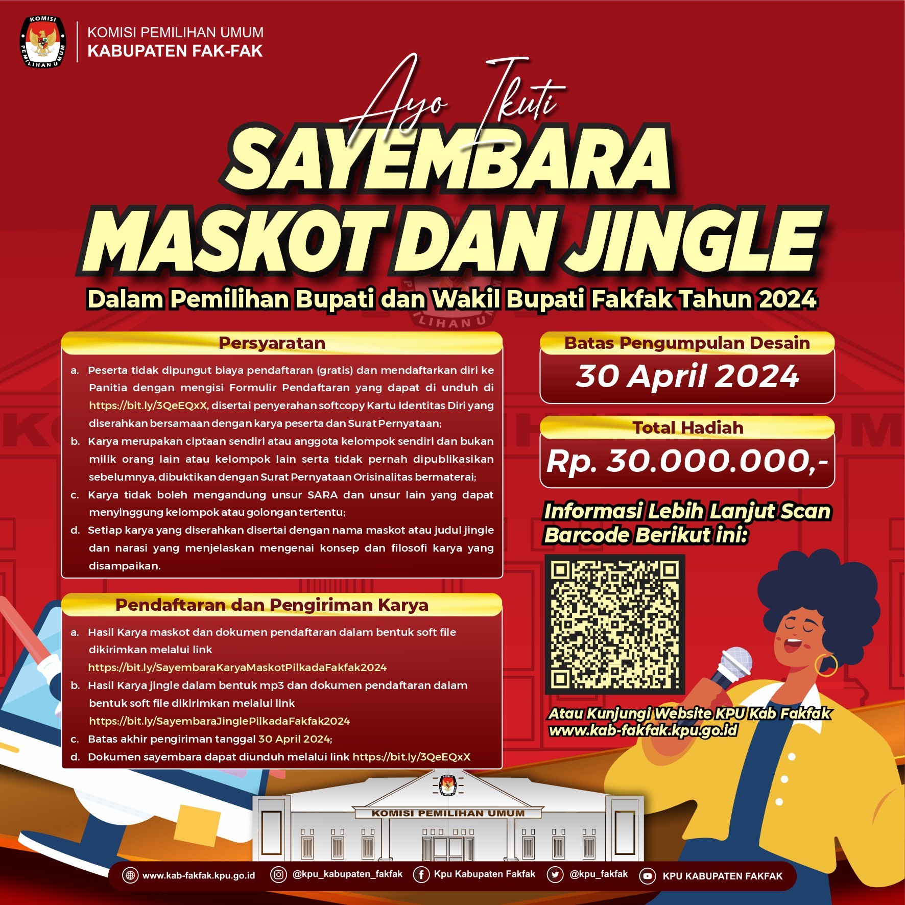 Dalam rangka menyemarakkan penyelenggaraan Pemilihan Bupati dan Wakil Bupati Kabupaten Fakfak Tahun 2024, Komisi Pemilihan Umum Kabupaten Fakfak mengadakan Sayembara Desain Maskot dan Jingle Pemilihan Bupati dan Wakil Bupati Kabupaten Fakfak Tahun 2024 dengan ketentuan silahkan download Pengumuman Lengkapnya disini Download Pengumuman Sayembara Maskot dan Jingle Informasi lebih lanjut dapat menghubungi Lia Marliaty Killian (085243316697) dan Muzdalifah W (085243943702).....