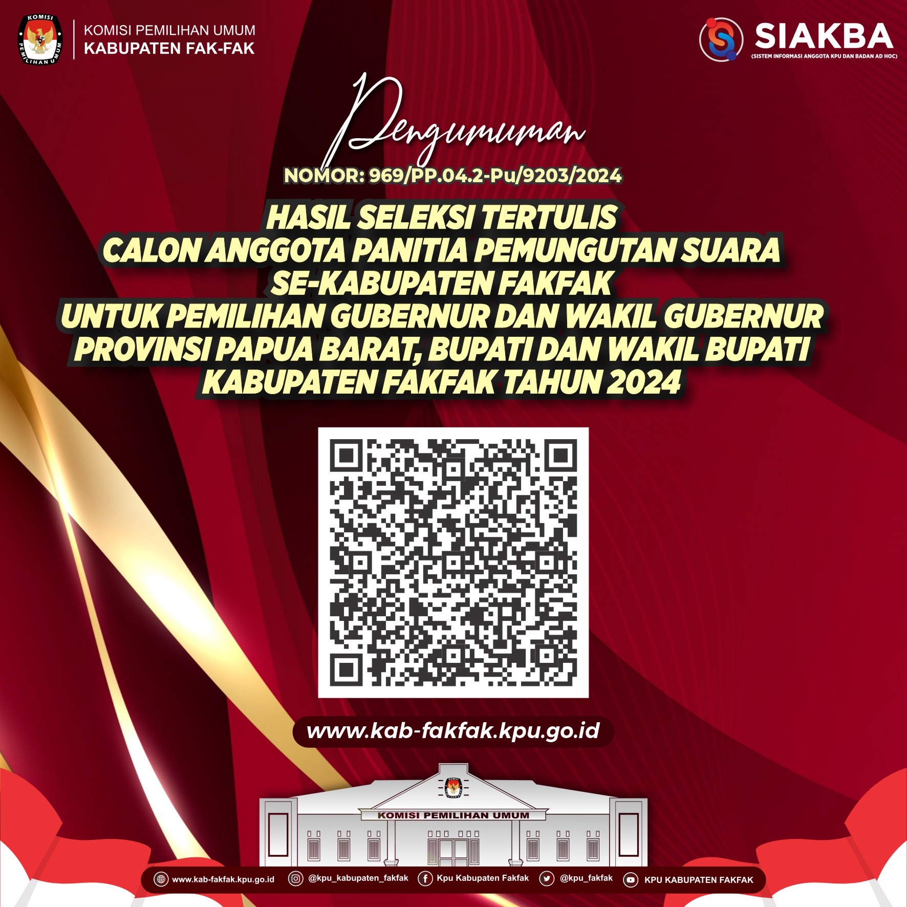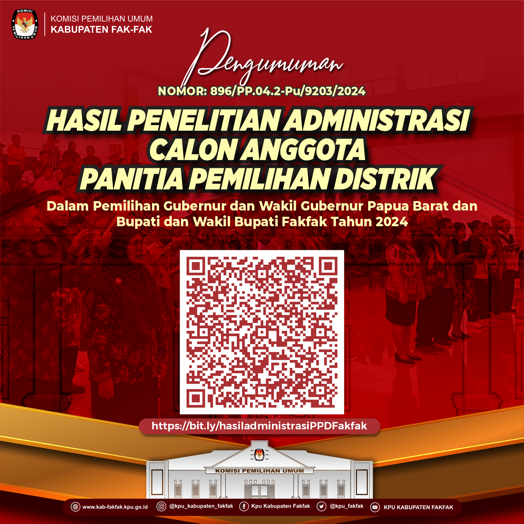 Berikut Pengumuman Hasil Penelitian Administrasi Calon Anggota PPD untuk Pemilihan Gubernur dan Wakil Gubernur Papua Barat, Bupati dan Wakil Bupati Kabupaten Fakfak Tahun 2024 DOWNLOAD....