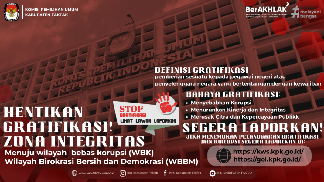 Komisi Pemilihan Umum (KPU) Kabupaten Fakfak terus berkomitmen mewujudkan tata kelola pemerintahan yang bersih, transparan, dan berintegritas melalui pembangunan Zona Integritas (ZI) menuju Wilayah Bebas dari Korupsi (WBK) dan Wilayah Birokrasi Bersih dan Melayani (WBBM). Pembangunan Zona Integritas ini merupakan langkah nyata KPU Kabupaten Fakfak dalam mencegah praktik gratifikasi, korupsi, kolusi, dan nepotisme (KKN) serta meningkatkan kualitas pelayanan publik yang profesional, akuntabel, dan berorientasi pada kepentingan masyarakat. Sebagai penyelenggara pemilu, KPU Kabupaten Fakfak menegaskan komitmen menolak segala bentuk gratifikasi, baik yang bersifat materi maupun non-materi, yang berpotensi memengaruhi integritas, independensi, dan profesionalisme dalam pelaksanaan tugas dan wewenang. Peran Masyarakat Sangat Penting Keberhasilan pembangunan Zona Integritas tidak dapat terwujud tanpa dukungan dan partisipasi aktif masyarakat. Oleh karena itu, KPU Kabupaten Fakfak mengajak seluruh masyarakat untuk berani melapor apabila menemukan : Dugaan praktik gratifikasi Penyalahgunaan wewenang Tindakan korupsi atau perilaku tidak berintegritas Pelayanan yang tidak sesuai dengan standar Segera Laporkan! Apabila masyarakat mengetahui atau mengalami indikasi pelanggaran tersebut, segera laporkan melalui laman pengaduan resmi Komisi Pemberantasan Korupsi (KPK) : [ KLIK DISINI UNTUK PENGADUAN GRATIFIKASI ] [ KLIK DISINI UNTUK PENGADUAN KORUPSI ] Setiap laporan akan ditindaklanjuti secara profesional, rahasia, dan bertanggung jawab sesuai dengan ketentuan peraturan perundang-undangan yang berlaku. Melalui semangat Zona Integritas, KPU Kabupaten Fakfak bertekad menghadirkan lembaga yang bebas dari korupsi dan gratifikasi, serta bersih dan melayani, demi terwujudnya demokrasi yang berkualitas dan berintegritas di Kabupaten Fakfak. Bersama kita wujudkan KPU Kabupaten Fakfak yang berintegritas, transparan, dan melayani. Tolak gratifikasi dan korupsi, laporkan setiap pelanggaran ....