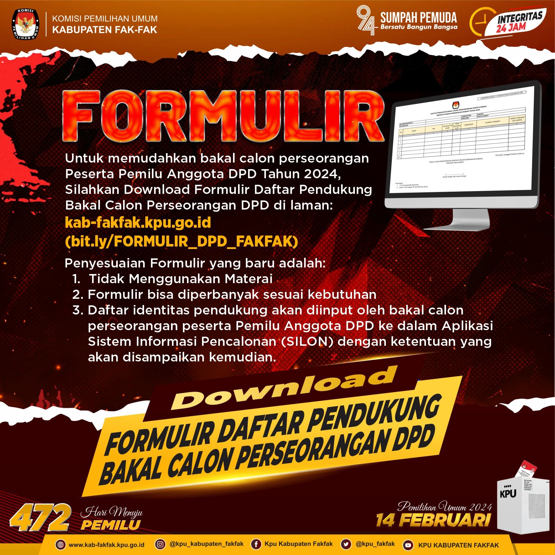 Untuk memudahkan bakal calon perseorangan Peserta Pemilu Anggota DPD Tahun 2024, Silahkan Download Formulir Daftar Pendukung Bakal Calon Perseorangan DPD: