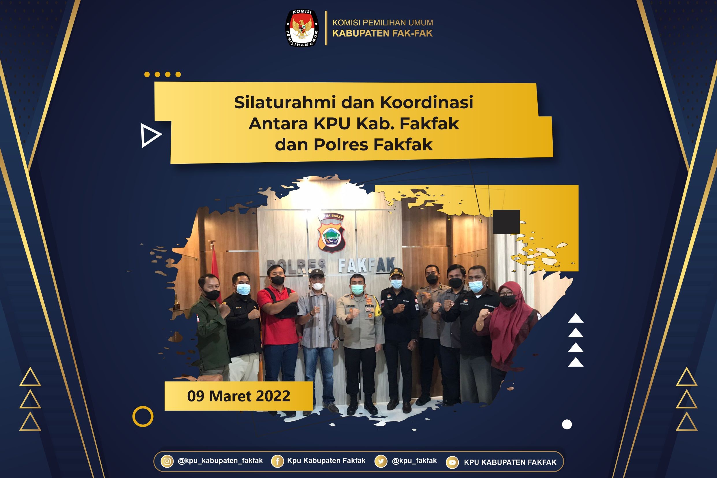Fakfak, 9 Maret 2022, bertempat di Mapolres Fakfak, Jl. Izaak Telussa, KPU Kabupaten Fakfak dipimpin oleh Ketua KPU dan di dampingi oleh Oleh Komisioner Divisi Program dan Data serta Sekretaris KPU Kabupaten beserta Staf, Melakukan Silaturahmi dengan Kapolres Fakfak yang baru Bapak Hendryana, hadir mendampingi Kabag Ops, Kasat Intel dan Kasat Reskrim.