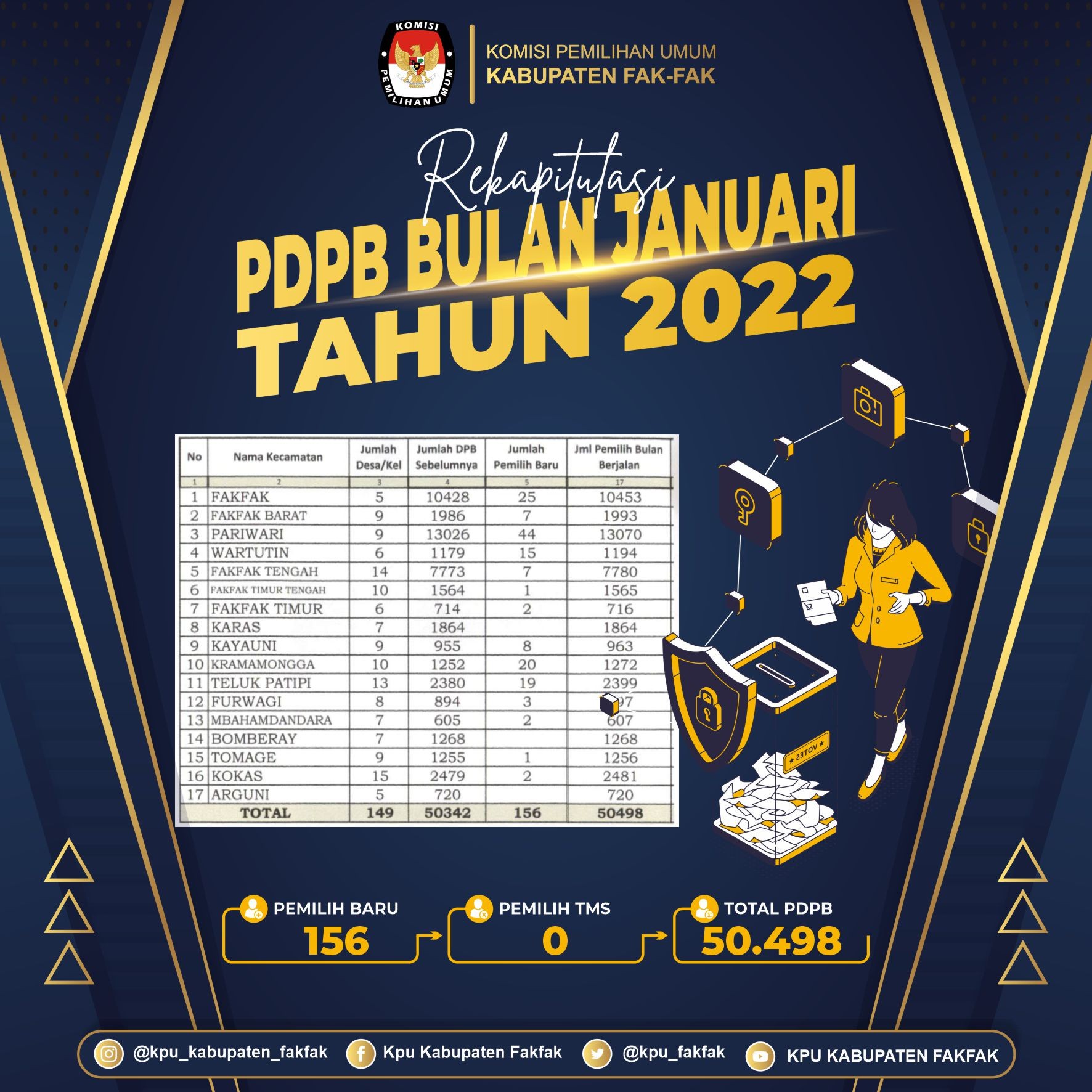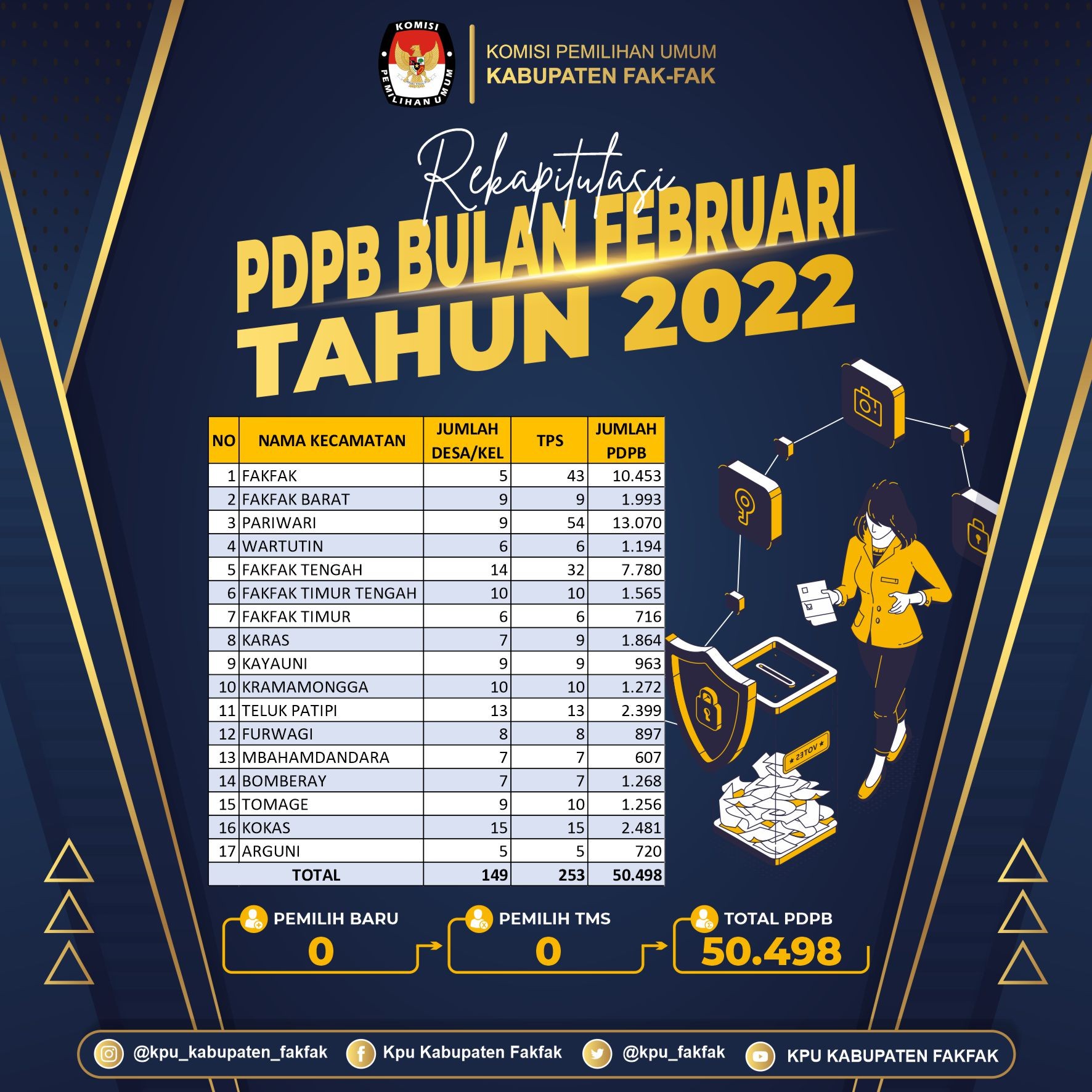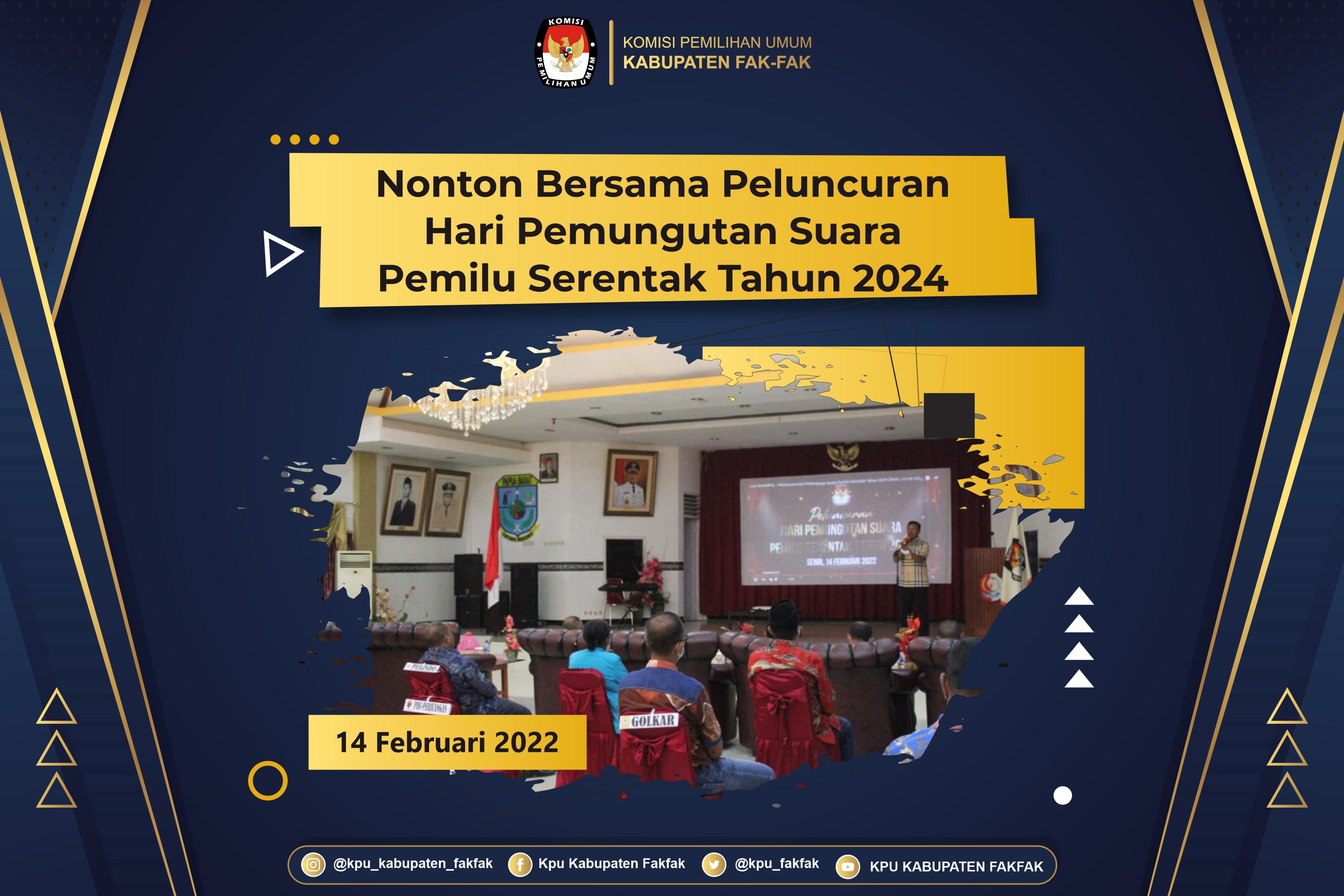 Kabupaten Fakfak - kab-fakfak.kpu.go.id Suasana Peluncuran Tahapan Hari Pemungutan Suara Pemilu Serentak Tahun 2024, yang dilaksankan Oleh KPU Republik Indonesia. Dan ikuti oleh Seluruh KPU Provinsi dan KPU Kabupaten/ Kota di Seluruh Indonesia. Pada kesempatan ini juga KPU Kabupaten Fakfak juga Melaksanakan Kegiatan Nonton Bareng Bersama Bupati Fakfak, Forkopimda, Pimpinan 16 Parpol serta, Tokoh Agama, Tokoh Masyarakat, dan Tokoh Pemuda di Kabupaten Fakfak. (14/02) Dalam Sambutannya Pak Ketua KPU Kabupaten Fakfak Menyampaikan Tanggal 14 Februari 2024 adalah Tanggal Pemungutan Suara Pemilu Serentak, maka pada hari ini senin Tanggal 14 Februari 2022 tepat 2 Tahun kita menuju hari Pemungutan Suara, kemudian hari ini merupakan moment Bersejarah perkembangan Demokrasi di Indonesia. pada kesempatan ini juga Dalam sambutan Bupati Fakfak Bapak Untung Tamsil selaku Pembina Politik di Tanah 1 Tungku 3 Batu ini mengajak semua pimpinan Partai Politik dan seluruh masyarakat agar sama-sama mensukseskan Tahapan Pemilu ini. Dan tidak lupa pula penyampaian Apresiasi yang positif kepada KPU Kabupaten Fakfak karena telah sukses menyelenggarakan Pemilihan Kepala Daerah Tahun 2020 kemarin. -MIP