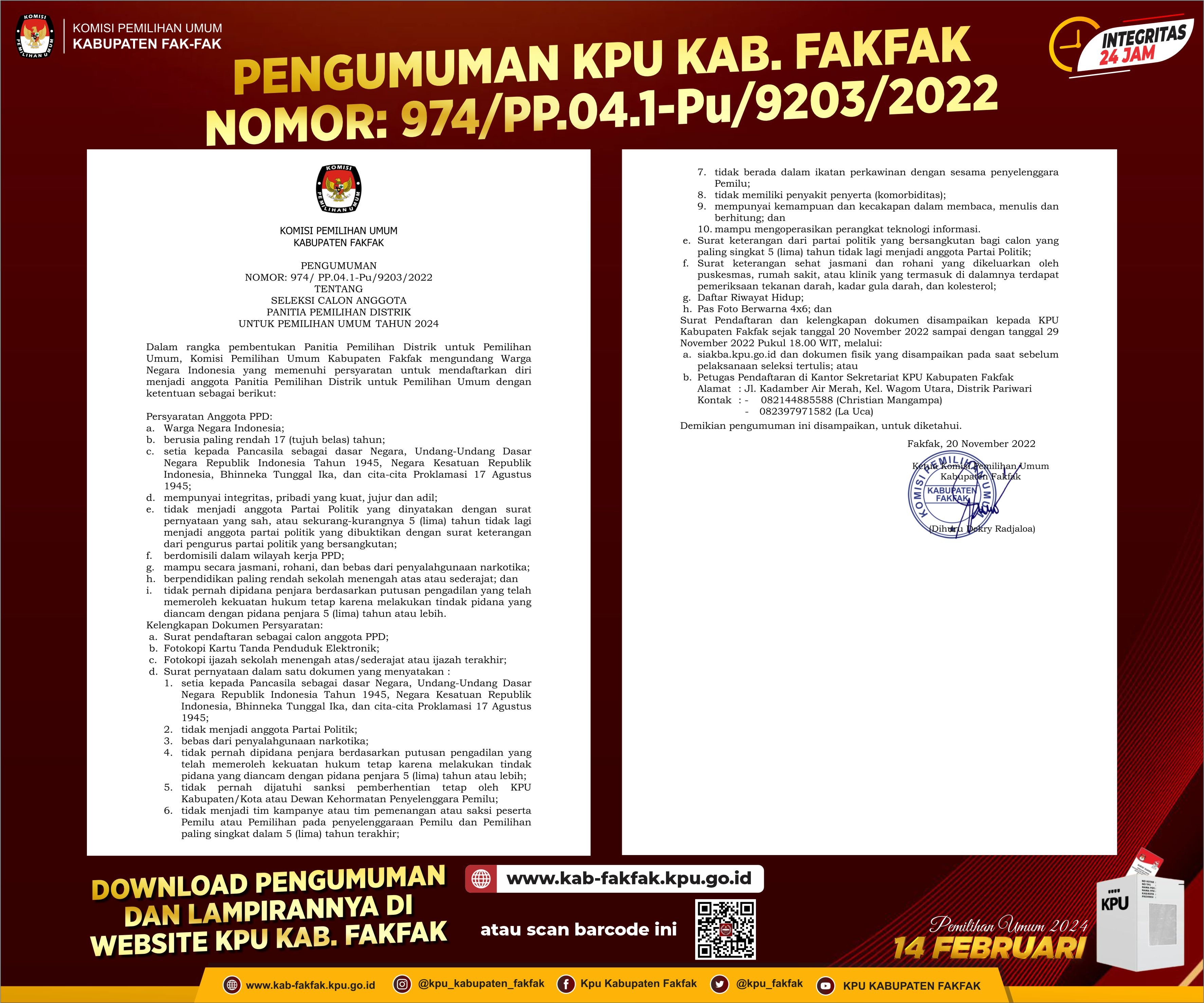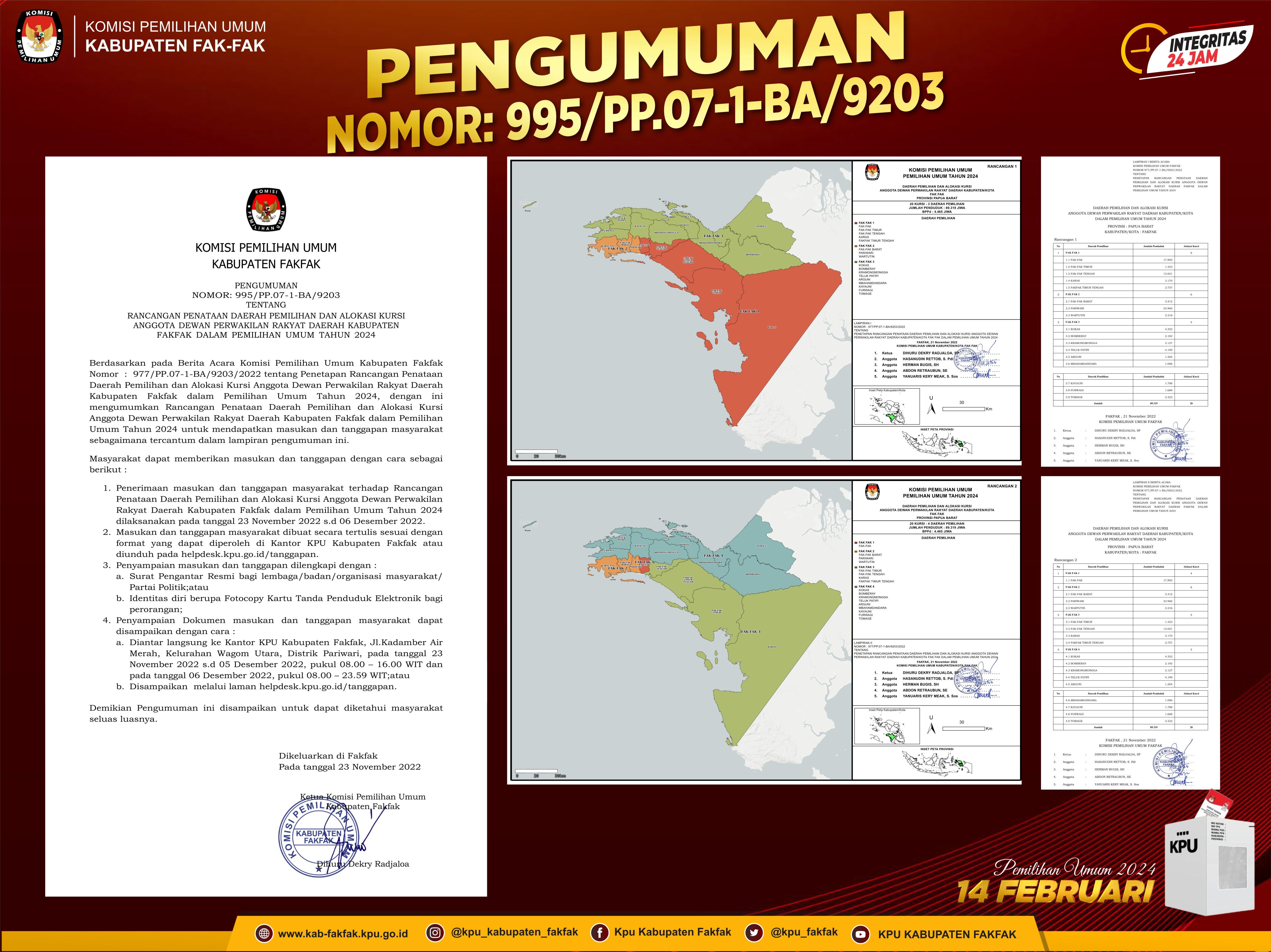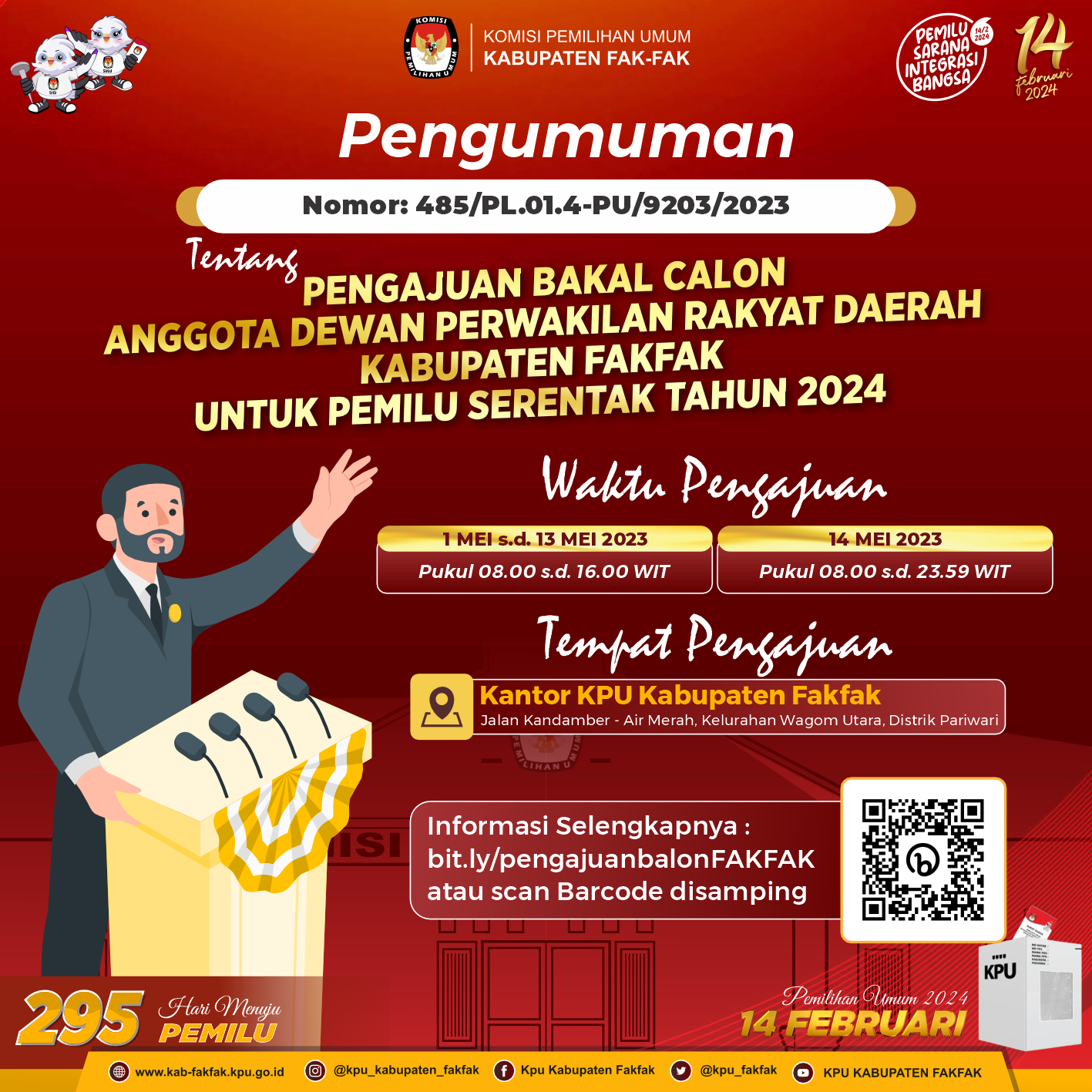 DOWNLOAD PENGUMUMAN Komisi Pemilihan Umum Kabupaten Fakfak membuka penerimaan pengajuan bakal calon anggota Dewan Perwakilan Rakyat Daerah (DPRD) Kabupaten Fakfak untuk Pemilu Serentak Tahun 2024 melalui Partai Politik Peserta Pemilu pada kepengurusan tingkat Kabupaten/Kota dengan ketentuan sebagai berikut: A. DOKUMEN PENGAJUAN 1. Surat Pengajuan menggunakan formulir MODEL B-PENGAJUAN- PARPOL dalam bentuk fisik disampaikan langsung dan digital yang diunggah di Silon; 2. Daftar Bakal Calon menggunakan formulir MODEL B- DAFTAR.BAKAL.CALON disertai foto diri terbaru bakal calon dan dilampiri dengan dokumen pengajuan bakal calon yang ditandatangani oleh Ketua Umum Partai Politik Peserta Pemilu atau nama lain dan Sekretaris Jenderal Partai Politik Peserta Pemilu atau nama lain yang sah sesuai dengan Keputusan Menteri yang menyelenggarakan urusan pemerintahan di bidang hukum dan hak asasi manusia tentang pengesahan susunan pengurus partai politik tingkat pusat dalam bentuk fisik disampaikan langsung dan digital yang diunggah di Silon; dan 3. Dokumen persyaratan administrasi Bakal Calon sebagaimana dimaksud dalam Pasal 12 sampai dengan Pasal 23 Peraturan KPU yang mengatur tentang Pencalonan Anggota DPR, DPRD Provinsi dan DPRD Kabupaten/Kota dalam bentuk digital diunggah di Silon. B. WAKTU DAN TEMPAT PELAKSANAAN PENGAJUAN 1. Waktu Pengajuan a. Hari/Tanggal : Senin, 1 Mei s.d Sabtu 13 Mei 2023 Waktu : Pukul 08.00 s.d 16.00 Waktu Setempat b. Hari/Tanggal : Minggu, 14 Mei 2023 Waktu : 08.00 s.d 23.59 Waktu Setempat 2. Tempat Pengajuan Kantor KPU Kabupaten Fakfak, Jalan Kadamber – Air Merah, Kelurahan Wagom Utara, Distrik Pariwari, Kabupaten Fakfak C. LAIN-LAIN 1. Ketentuan Pengajuan Bakal Calon Anggota DPRD Kabupaten/Kota : a. Partai Politik Peserta Pemilu pada kepengurusan tingkat Kabupaten Fakfak dapat mengajukan bakal calon Anggota DPRD Kabupaten Fakfak apabila telah: 1) memperoleh persetujuan dari Ketua Umum Partai Politik Peserta Pemilu atau nama lain dan Sekretaris Jenderal Partai Politik Peserta Pemilu atau nama lain yang sah. 2) mengirimkan data dan dokumen persyaratan yang diunggah melalui Silon. b. Pengajuan sebagaimana dimaksud huruf a dilakukan oleh: 1) Ketua Partai Politik Peserta Pemilu pada kepengurusan tingkat Kabupaten Fakfak atau nama lain dan sekretaris Partai Politik Peserta Pemilu pada kepengurusan tingkat Kabupaten Fakfak atau nama lain yang sah, 2) dalam hal Ketua Partai Politik Peserta Pemilu pada kepengurusan tingkat Kabupaten Fakfak atau nama lain dan Sekretaris Partai Politik Peserta Pemilu pada kepengurusan tingkat Kabupaten Fakfak atau nama lain yang sah sebagaimana dimaksud pada huruf 1) tidak dapat hadir pada saat pengajuan bakal calon, pengajuan dapat diwakili oleh pengurus Partai Politik Peserta Pemilu pada kepengurusan tingkat Kabupaten Fakfak dengan menyampaikan surat kuasa dari ketua Partai Politik Peserta Pemilu pada kepengurusan tingkat Kabupaten Fakfak atau nama lain dan sekretaris Partai Politik Peserta Pemilu pada kepengurusan tingkat Kabupaten Fakfak atau nama lain yang sah ; 3) dalam hal Pengurus Partai Politik Peserta Pemilu pada kepengurusan tingkat Kabupaten Fakfak tidak dapat melakukan pengajuan bakal calon Anggota DPRD Kabupaten Fakfak sebagaimana dimaksud pada angka 2), pengajuan persyaratan bakal calon dapat dilakukan oleh Petugas Penghubung Partai Politik Peserta Pemilu pada kepengurusan tingkat Kabupaten Fakfak. 2. Dalam hal pemeriksaan kelengkapan dokumen pengajuan bakal calon ditemukan: a. isian data dan dokumen persyaratan pengajuan bakal calon tidak lengkap; b. daftar Bakal Calon sebagaimana dimaksud pada huruf A angka 2 tidak memenuhi persyaratan pengajuan Bakal Calon sebagaimana dimaksud dalam Pasal 8 ayat (1) Peraturan KPU tentang Pencalonan Anggota DPR, DPRD Provinsi dan DPRD Kabupaten/Kota.; dan/atau c. dokumen fisik surat pengajuan dan/atau daftar Bakal Calon sebagaimana dimaksud pada huruf A angka 1 dan angka 2 tidak benar. KPU Kabupaten Fakfak mengembalikan dokumen pengajuan bakal calon kepada Partai Politik Peserta Pemilu pada kepengurusan tingkat Kabupaten Fakfak. 3. Partai Politik Peserta Pemilu yang Pengajuan bakal calon anggota DPRD Kabupaten Fakfak dikembalikan sebagaimana dimaksud angka 2 masih dapat mengajukan bakal calon sampai dengan batas akhir waktu pengajuan pada Hari Terakhir. 4. Dokumen surat pengajuan dan daftar bakal calon sebagaimana dimaksud huruf A angka 1 dan angka 2, dapat diunduh pada laman https://silon.kpu.go.id. 5. Pelayanan dan penjelasan informasi terkait pengajuan bakal calon anggota DPRD Kabupaten Fakfak dapat menghubungi helpdesk KPU Kabupaten Fakfak : a. pada hari kerja dari pukul 08.00 s.d 17.00 WIB b. No Hp : 1. 0811485674 (Rahmat Eko Widyanto) 2. 082198447071 (Jubair Fadirubun)