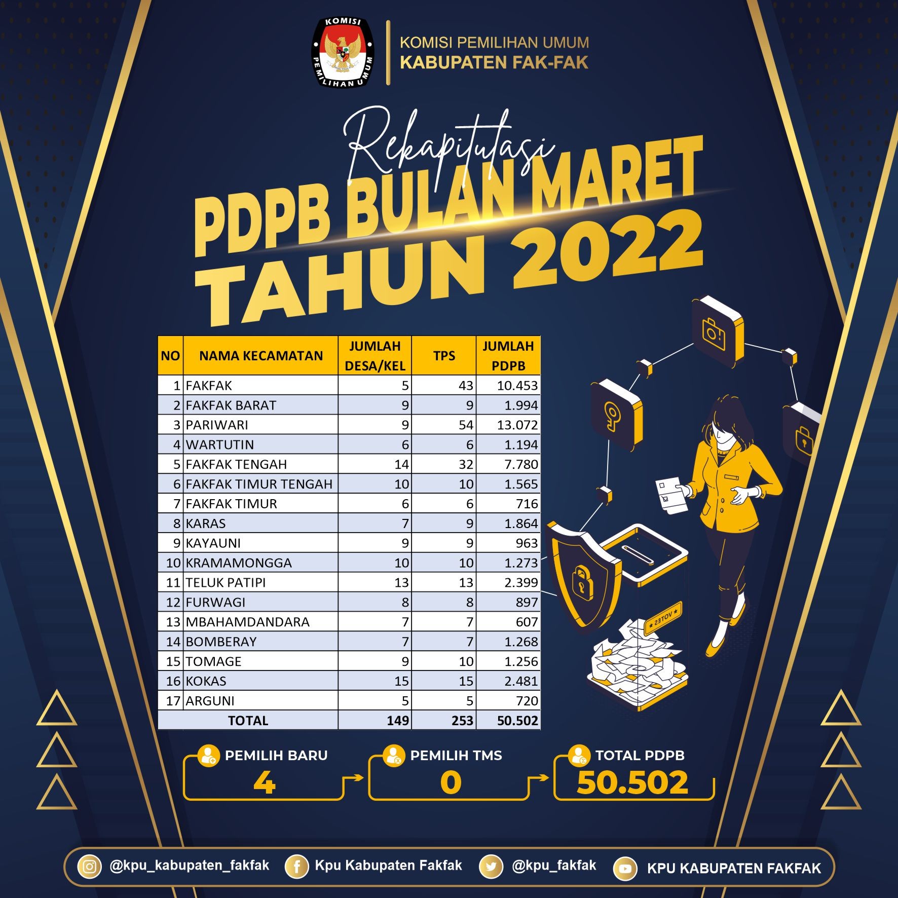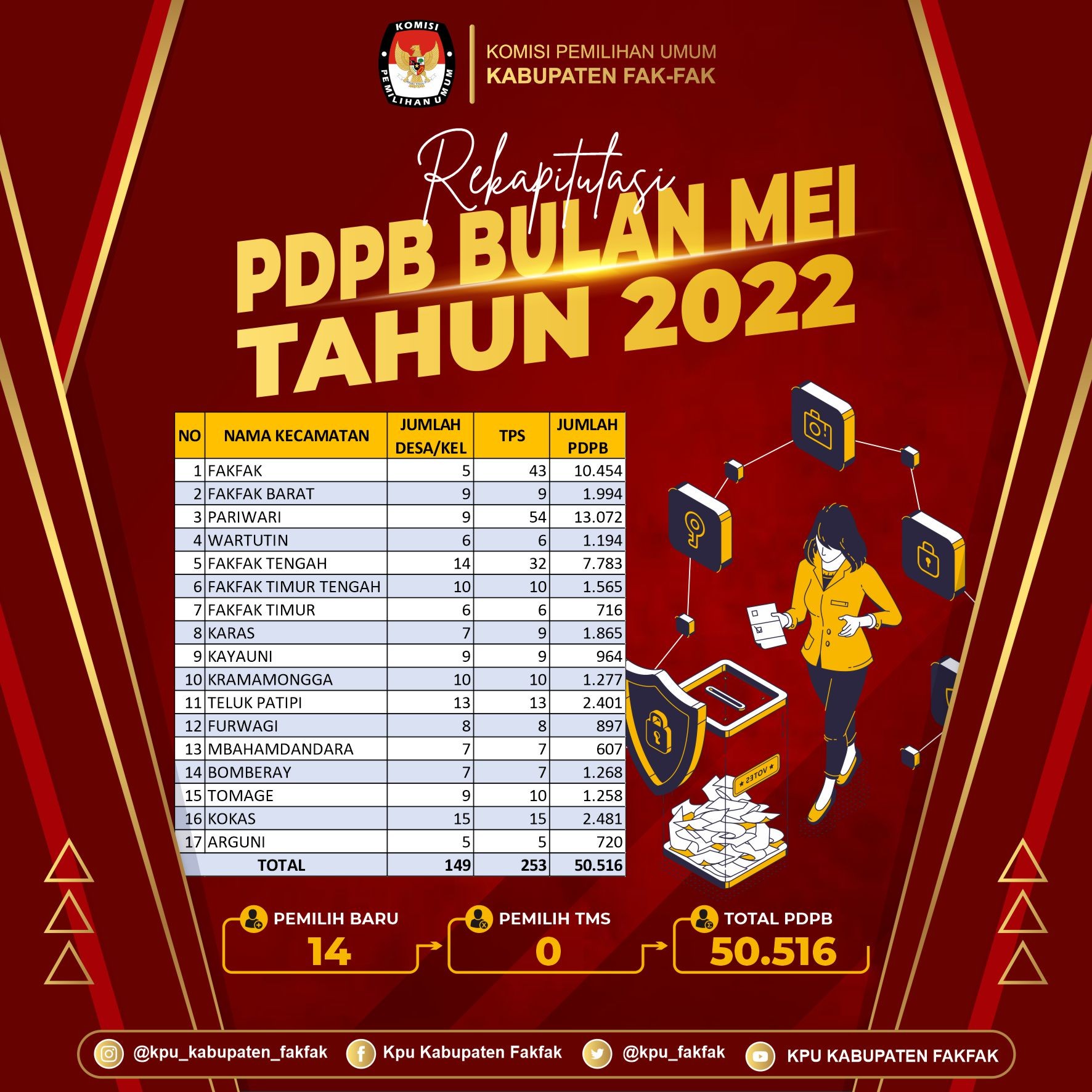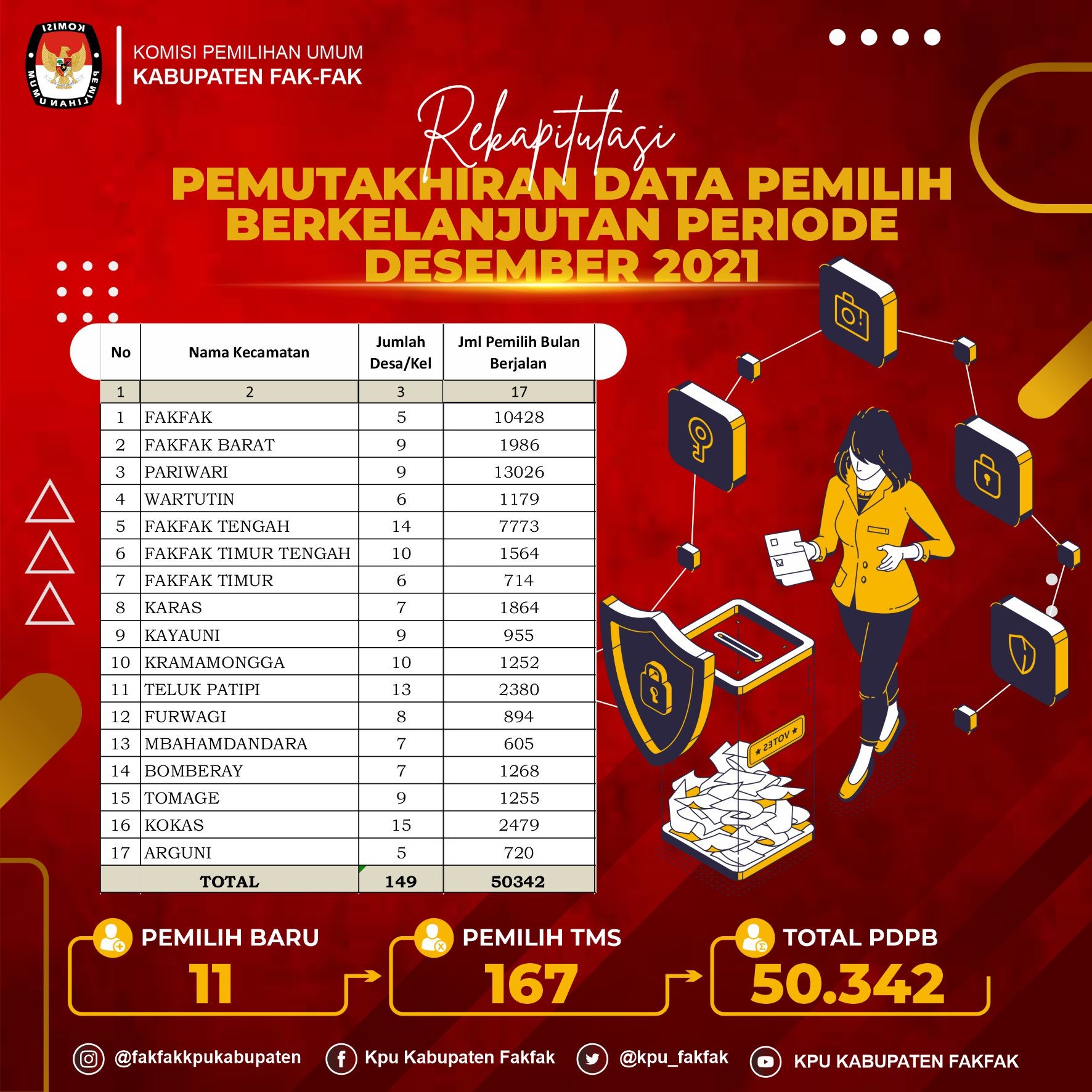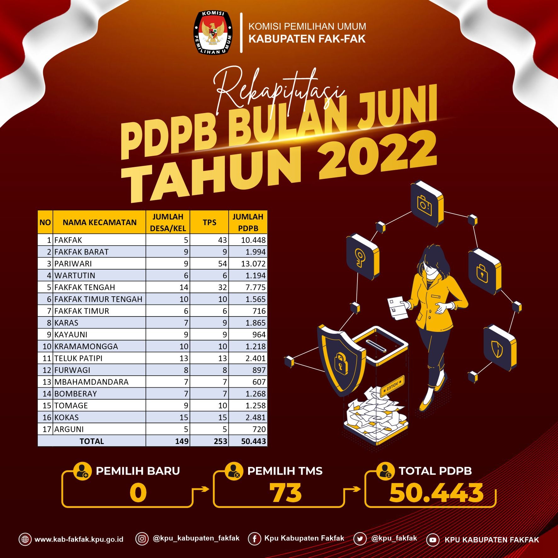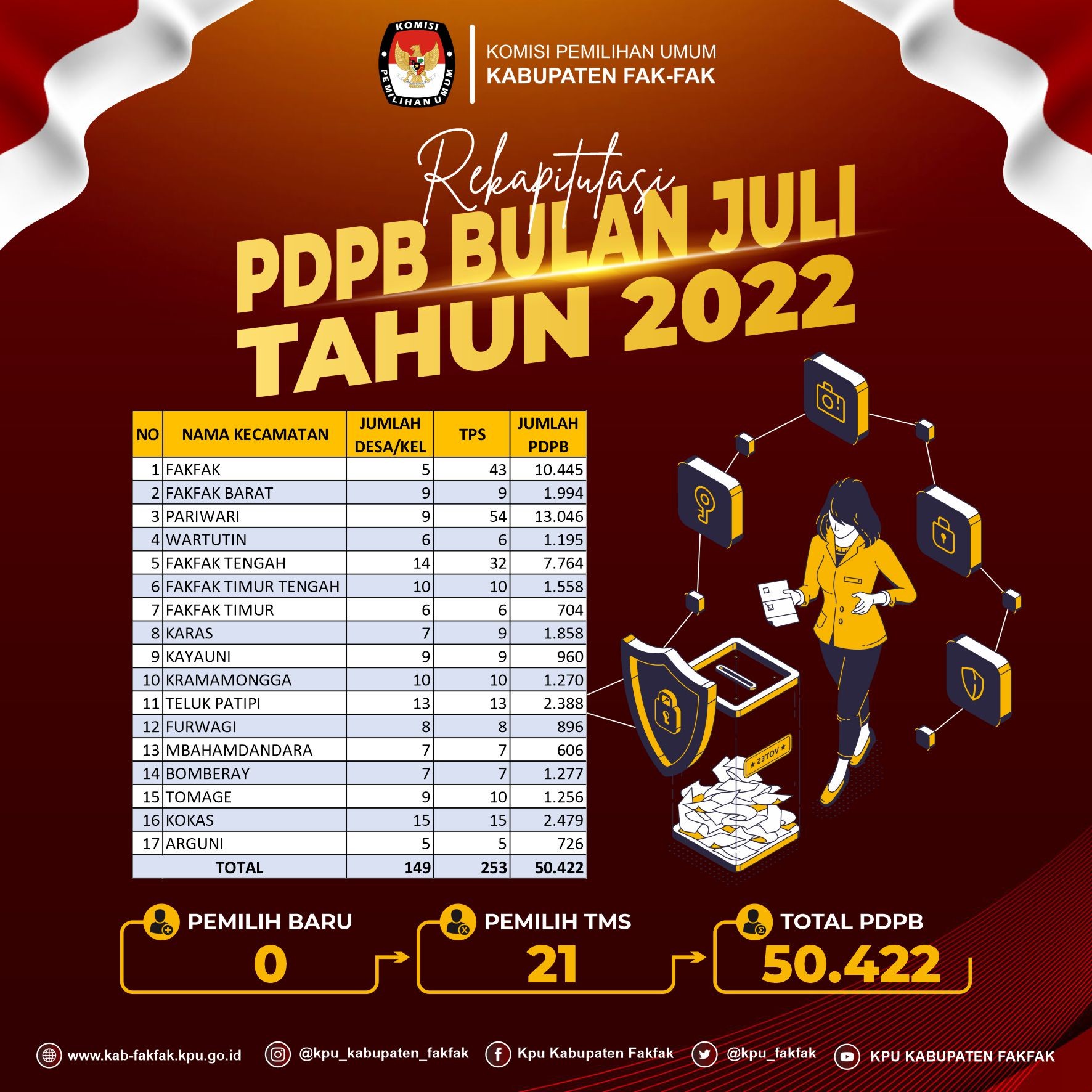 Rekapitulasi Daftar Pemilih Berkelanjutan Bulan Juli berjumlah sebanyak 50.422 Pemilih dengan rincian Pemilih laki-laki berjumlah 25.345 Pemilih dan Pemilih perempuan berjumlah 25.077 Pemilih, tersebar di 17 Distrik dan 149 Kelurahan, adapun perubahan Daftra Pemilih Berkelanjutan pada Bulan Juli ini menjadi 50.422 Pemilih dikarenakan terdapat 21 Pemilih meninggal dunia berdasarkan masukan dari Kepala Sekolah SMA, SMK, MA/Sederajat, Dinas Kependudukan dan Catatan Sipil Kabupaten Fakfak, Masukan dan tanggapan masyarakat.